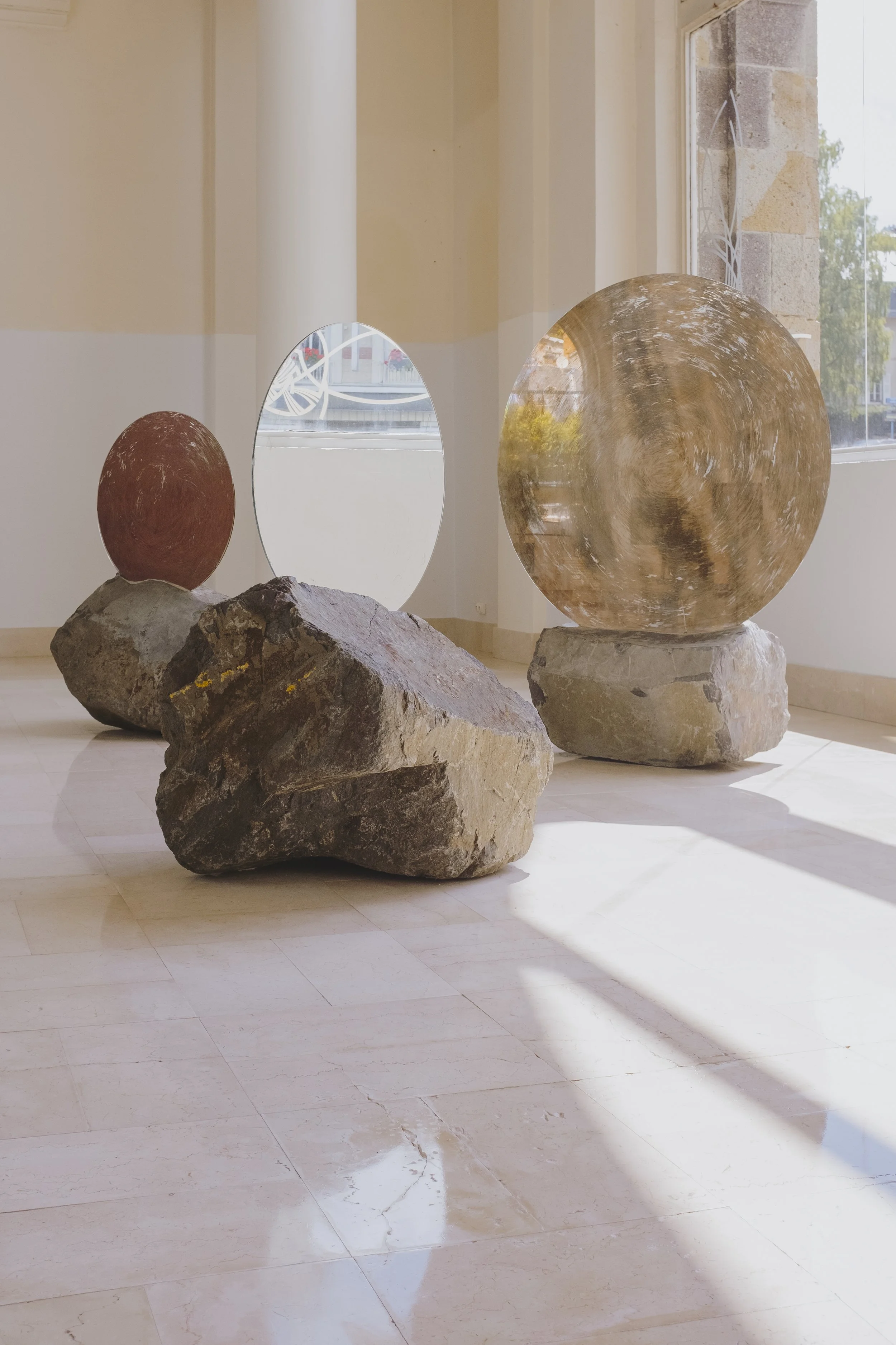 Au coeur des Grandes Thermes de La Bourboule, les miroirs aux formes rondes sont suspendus sur des roches volcaniques de la région. Réduite à l’épure, cette installation rejoint les éléments et invite au dialogue par une mise en abîme. Les miroirs assemblent deux surfaces.